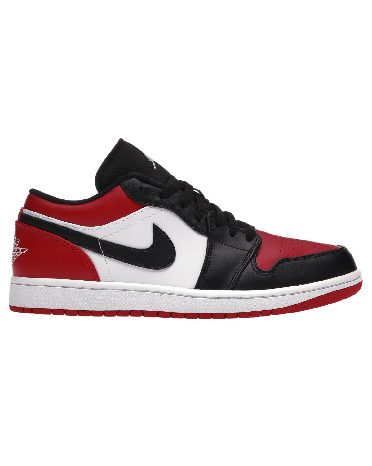 Buty Air Jordan 1 Low Bred Toe, to kultowe i ponadczasowe wydanie. Są inspirowane oryginalnym modelem z lat 80. Prosty i klasyczny design prezentuje się zawsze świeżo, pasuje do każdej stylizacji. Model jest wykonany z skóry licowej z efektownymi panelami bocznymi. Swoosh nadaje tym butom wyrazisty wygląd, podobnie jak podeszwa zewnętrzna, kołnierz i język. W detalach towarzyszących projektowi widoczne są akcenty czerwieni, czerni i bieli. Biała podeszwa środkowa i czarna podeszwa zewnętrzna uzupełniają ten projekt retro.